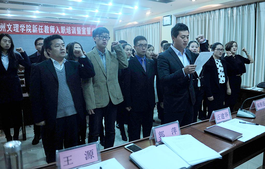 2015年11月18日上午,学校在视频会议室举行了新任教师入职宣誓仪式。校长汪建华,副校长郑伟强、人事处处长郭萍、教务处处长薛怀庆、科技处处长王源、文学院院长马晖以及2015年新任教师参加了宣誓仪式,宣誓仪式由副校长郑伟强同志主持。